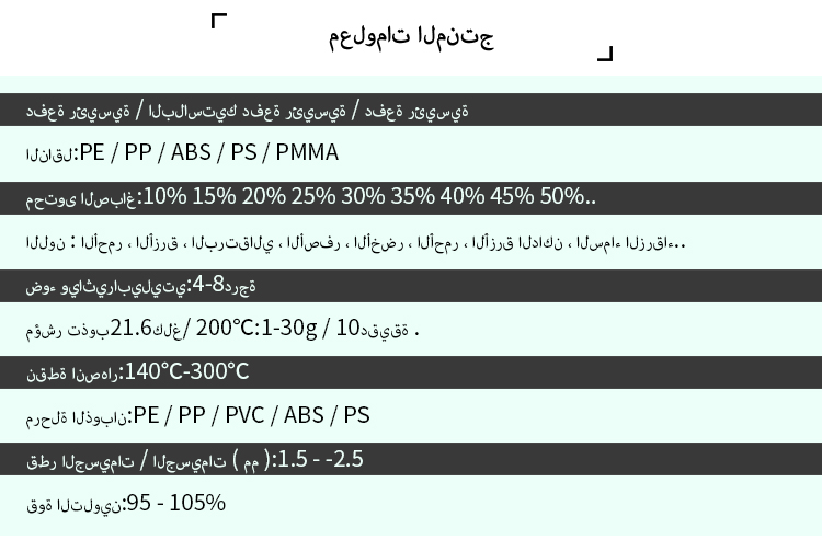 الكلمات المفتاحيه: Modified Masterbatch Functional Masterbatch White Masterbatch Black Masterbatch Colour Masterbatch Filler masterbatch Laser Masterbatch Desiccant masterbatch Ungrouped