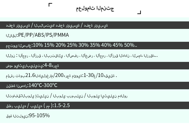 الكلمات المفتاحيه: Modified Masterbatch Functional Masterbatch White Masterbatch Black Masterbatch Colour Masterbatch Filler masterbatch Laser Masterbatch Desiccant masterbatch Ungrouped