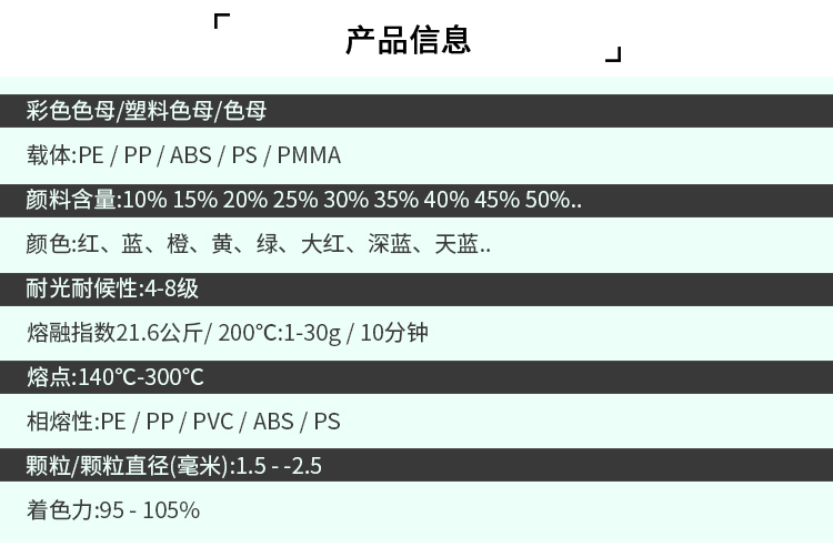 关键词: 彩色色母粒 白色色母粒 黑色色母粒 消泡色母粒 激光色母粒
