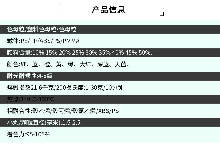 关键词: 彩色色母粒 白色色母粒 黑色色母粒 消泡色母粒 激光色母粒
