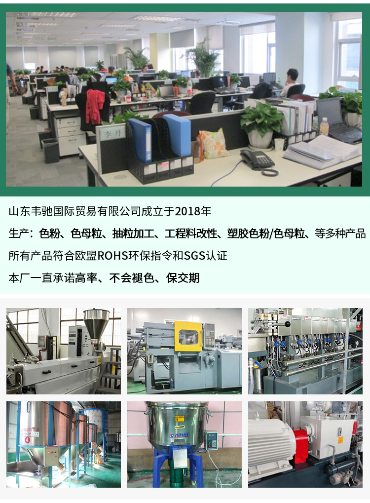 山东韦驰国际贸易有限公司公司成立2018年,是一家生产:色粉、色母粒、抽粒加工、工程料改性、塑胶色粉/色母粒、搪胶色粉/色母粒、FDA食品级色粉/色母粒、无卤色粉/色母粒、高温色粉/色母粒、变色粉、黑色母、彩色母、硫云色母、木纹色母、等高难度配色经验、所有产品符合欧盟ROHS环保指令和SGS认证、本厂一直承诺高率、不会褪色、保交期。本着珍惜每一客户、合理的价格、保证每一份色粉色母质量、热情积极的服务、以保客户交期为宗旨、与客户建立了良好的关系、并得到了各方的信任。同时技术的熟练程度得到了广大客户的好评。创新、诚信、团队合作、品质有保证、希望能与您共创辉煌。