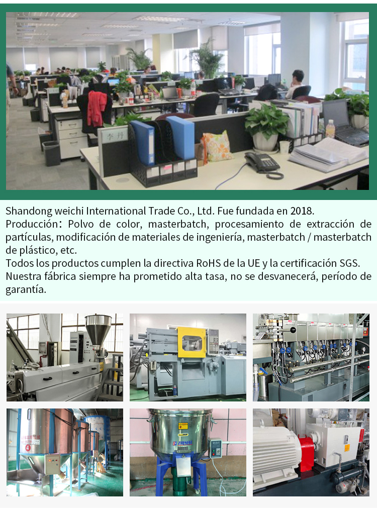 Shandong weichi International Trade Co., Ltd. Fue fundada en 2018, es una producción: pigmento, masterbatch de color, procesamiento de granos, modificación de materiales de ingeniería, pigmento plástico, masterbatch de color, masterbatch de Goma / masterbatch de grado alimentario de la FDA, masterbatch de color / masterbatch de color / masterbatch de color libre de halógenos, masterbatch de color, masterbatch de color de alta temperatura / masterbatch, masterbatch de color, masterbatch de color negro, masterbatch de color, azufre, mica grain, Masterbatch de madera, como la experiencia de color difícil de emparejar, todos los productos cumplen con la directiva RoHS de la UE y la certificación SGS nuestra fábrica siempre ha prometido una alta tasa, sin decoloración, tiempo de entrega garantizado. En el espíritu de apreciar a cada cliente, precio razonable, garantizar la calidad de cada maestro rosa, servicio entusiasta y activo, con el fin de garantizar la entrega de los clientes para el propósito, y establecer una buena relación con los clientes, y la confianza de todas las partes. Al mismo tiempo, nuestro nivel técnico también ha sido elogiado por los clientes. Innovación, integridad, trabajo en equipo, garantía de calidad, esperamos crear brillante con usted.