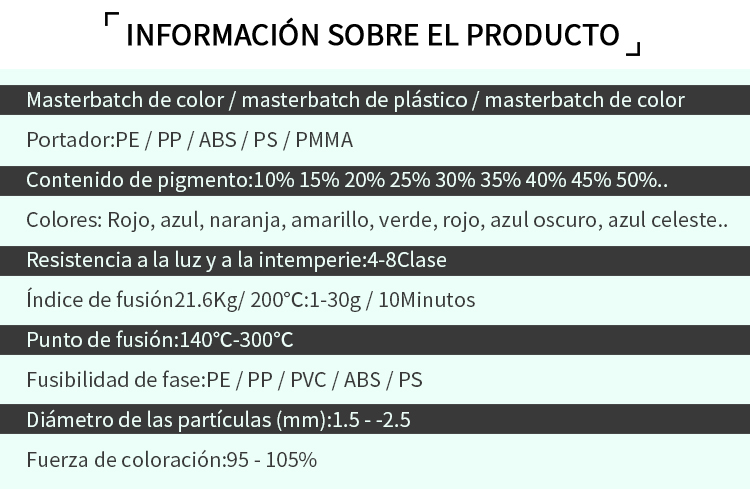 Palabras clave: Modified Masterbatch Functional Masterbatch White Masterbatch Black Masterbatch Colour Masterbatch Filler masterbatch Laser Masterbatch Desiccant masterbatch Ungrouped