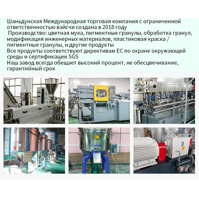 шаньдун вэйсчи Международная торговая компания ооо создана в 2018 году, является производство: пигменты, цветные материнские, зерновые, инженерные материалы, модифицированы, пластмассовые краски, цветные, не связанные с гелеобразными красками / пищевые продукты FDA, цветные / цветные / маточные, высокотемпературные / материнские / цветные, цветные, черные матери, цветные, сера, слюдяные гранулы, деревянная пигментная мать, как, например, сложный опыт, все продукты в соответствии с директивами ЕС по охране окружающей среды и SGS сертификации наших заводов всегда обещают высокий процент, не обесцвечивание, чтобы гарантировать время поставки. в духе дорожить каждым клиентом, разумная цена, обеспечить качество каждого розового мастера, энтузиазм и активность обслуживания, чтобы обеспечить доставку товаров клиентам, установить хорошие отношения с клиентами и получить доверие всех сторон. В то же время наш технический уровень также получил высокую оценку клиентов. инновация, честность, командное сотрудничество, гарантия качества, надеюсь, что вместе с вами создать блестящий.