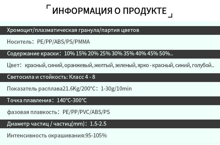 ключевое слово: Modified Masterbatch Functional Masterbatch White Masterbatch Black Masterbatch Colour Masterbatch Filler masterbatch Laser Masterbatch Desiccant masterbatch Ungrouped